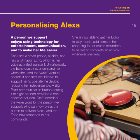 She uses a smart phone, a tablet, and has an Amazon Echo, which is her voice activated assistant. Unfortunately, the Echo could not understand her when she used the ‘wake’ word to operate it and staff would have to support her to operate the device, reducing her independence. A Big Point communication button costing just eight pounds provided a cost effective solution. Staff recorded