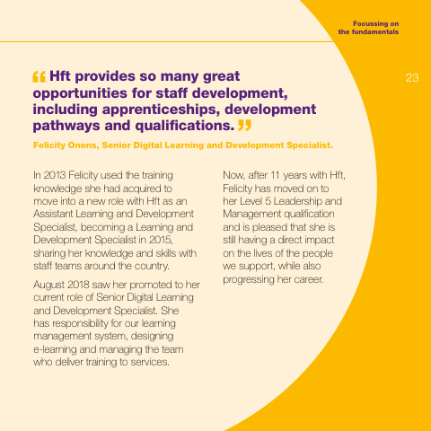 Now, after 11 years with Hft, Felicity has moved on to her Level 5 Leadership and Management quali cation and is pleased that she is still having a direct impact on the lives of the people we support, while also progressing her career.
