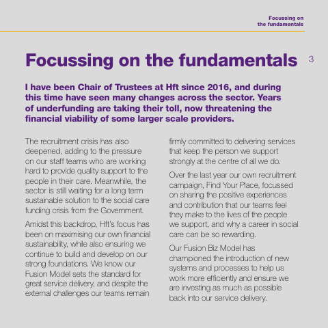 I have been Chair of Trustees at Hft since 2016, and during this time have seen many changes across the sector. Years of underfunding are taking their toll, now threatening the nancial viability of some larger scale providers.