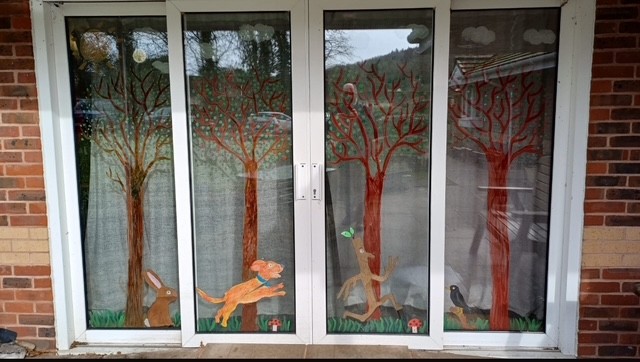 The windows at Oaktree have been decorated with the theme from The Stick Man which was chosen by the individuals who live there.