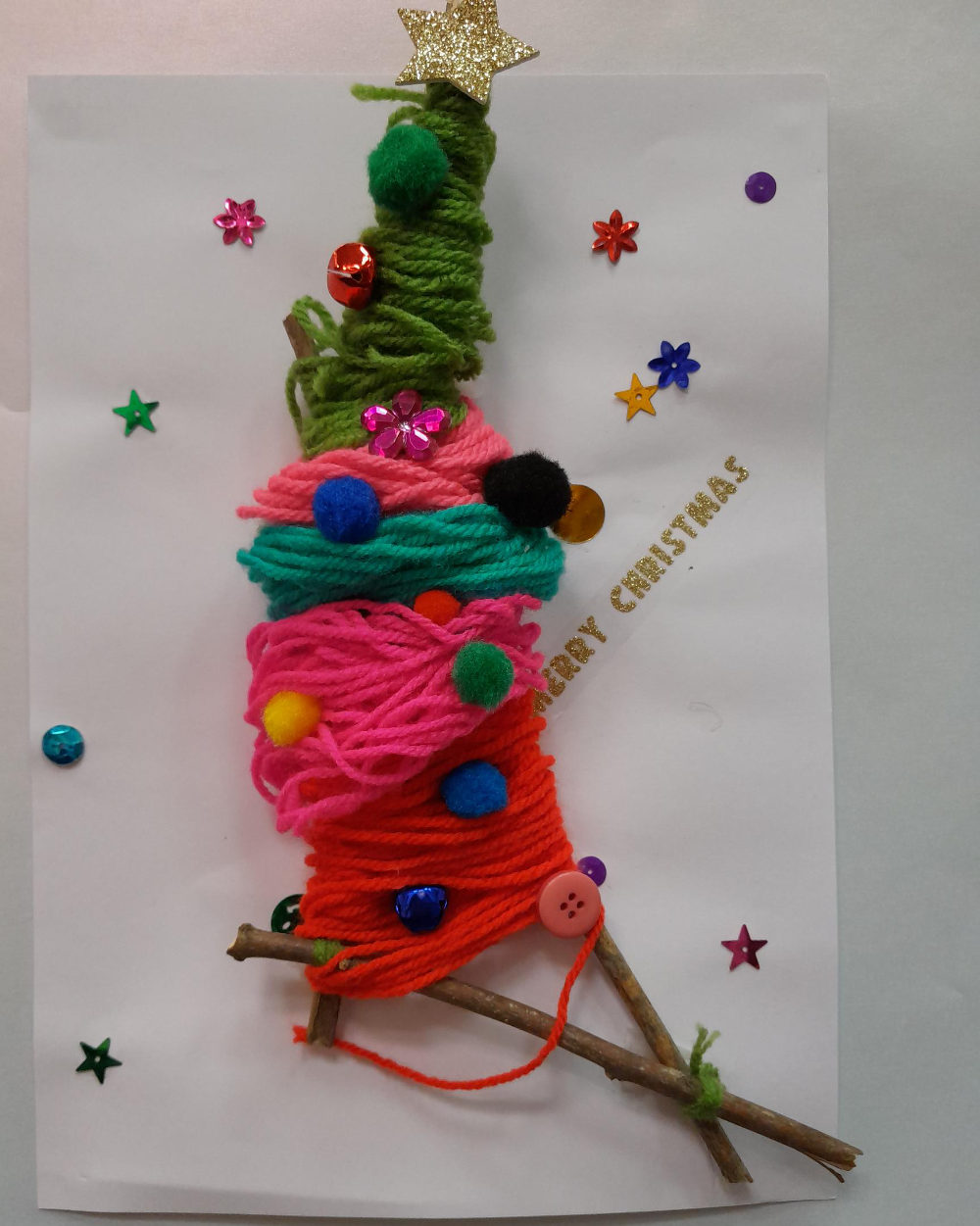 Dinesh’s festive card took things to a whole new level! A 3D Christmas tree, made up of varying colours of wool, pom-pom decorations, real twigs and a glittery gold star. The judges said: